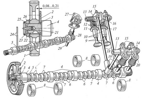 1 – зубчатое колесо; 2 – упорный фланец; 3 – распорное кольцо; 4 -передняя опорная шейка; 5 – эксцентрик; 6, 7 – соответственно впускные и выпускные кулачки; 8 – опорные втулки; 9 – клапаны; 10 – направляющие втулки; 11 и 17 – шайбы; 12 – пружины; 13 – оси коромысел; 14 – коромысла; 15 – регулировочный болт; 16 – стойки осей коромысел; 18 – штанги; 19 – толкатели; 20 – тарелки; 21 – пружина центробежного датчика; 22 – валик датчика; 23 – стопорное кольцо; 24 – штанга привода бензонасоса; 25 – шайба; 26 – гайка; 27 – корпус привода; 28 – шестерня привода; 29 – валик привода распределителя зажигания и смазочного насоса.