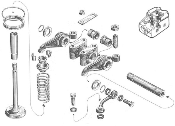Штанга через регулировочный винт 14 воздействует на короткое плечо коромысла 11, которое, поворачиваясь на оси 12, нажимает своим носком на стержень клапана 2.При этом пружина 6 сжимается, а клапан перемещается вниз, отходит от седла 1, обеспечивая в зависимости от назначения клапана впуск горючей смеси или выпуск отработавших газов. После того как выступ кулачка 17 выйдет из-под толкателя 16, клапанный механизм возвращается в исходное положение под воздействием пружины 6.
