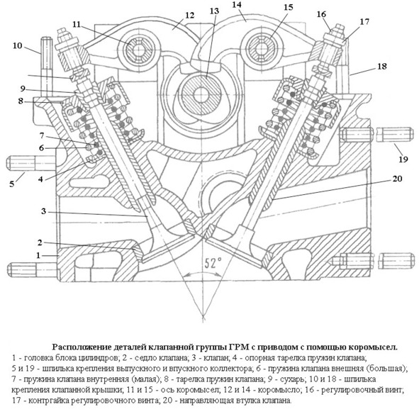 Привод клапанов с помощью коромысел имеет следующие детали: коромысло, ось коромысел, штангу, промежуточный толкатель.