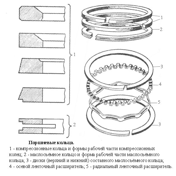На поршнях современных двигателей устанавливают по два – три кольца. По назначению кольца делятся на компрессионные кольца и маслосъёмные кольца. Компрессионные кольца устанавливаются в верхней части головки поршня и отвечают за уплотнение поршня в цилиндре. Маслосъёмные кольца устанавливаются под компрессионными кольцами и отвечают за снятие излишек масла со стенок цилиндров. Излишки масла через прорези в кольце и отверстия в поршневой канавке маслосъёмного кольца сбрасываются под поршень и далее стекают в картер двигателя. Маслосъёмные кольца – составные и имеют в своём составе непосредственно кольцо (или два кольца – диска) и пружинный расширитель.