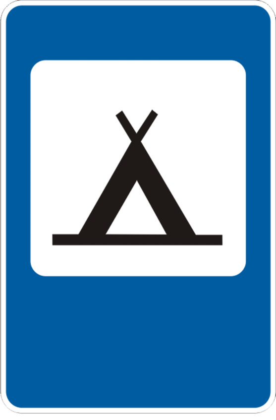 Знак 7.10 «Кемпинг» информирует об оборудованном и охраняемом летнем лагере для автотуристов c площадками для установки палаток и местами для стоянки автомобилей.