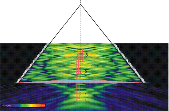 Одним из важных аспектов при рассмотрении свойств рупорной антенны является анализ распределения плотности энергии в рабочей зоне. Подобная задача была решена в отношении электромагнитного поля путём численного моделирования. Единые закономерности проявления фундаментальных свойств волновых процессов позволяют считать данное решение корректным и для полей другой физической природы. При моделировании учитывалось наличие корректирующей линзы, обеспечивающей дополнительный фокусирующий эффект. На рис.74. представлен графический результат моделирования, иллюстрирующий распределение плотности поля в области апертуры рупорной антенны с геометрическими соотношениями, эквивалентными параметрам пирамиды Хуфу. Синий цвет – минимальная плотность. Жёлтый (переходящий в красный) – максимальная.