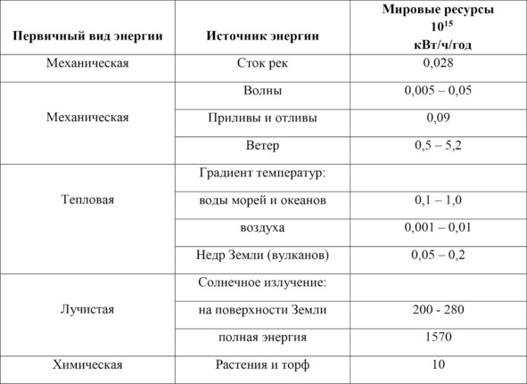 Табл. 2. Традиционные мировые ресурсы возобновляемой энергии [1]