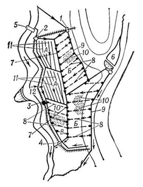 А – луга, Б – кормовой севооборот, В – овощной севооборот; 1, 2 – отверстия в дамбе обвалования для регулирования затопления поймы паводковыми водами, 3 – оросительная насосная станция, 4 – осушительная насосная станция, 5 – шлюз на реке, 6 – водохранилище на притоке, 7 – магистральный осушительный канал, 8 – коллекторы, 9 – нагорные каналы (они же водоподводящие каналы для увлажнения), 10 – дрены, 11 – открытые собиратели, 12 – дамба обвалования. Луга осушены системой открытых собирателей, площади под севооборотами – дренажем. Во время весеннего половодья пойма затопляется через отверстия 1, 2 на заданный срок; избыток воды сбрасывается самотёком или откачивается насосной станцией. Увлажнение лугов проводится при весеннем затоплении, земель овощного севооборота – дождеванием, кормовых – подпочвенным увлажнением по дренам. Вода для орошения может забираться из реки выше шлюза 5, из водохранилища на притоке и насосной станцией 3. Стрелки показывают направление движения воды.