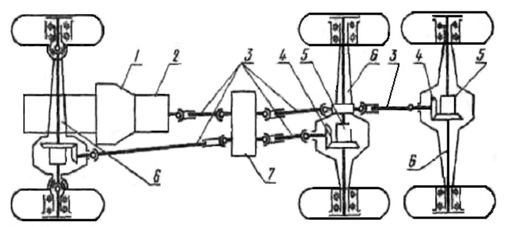 1 – сцепление; 2 – коробка передач; 3 – карданная передача; 4 – главная передача; 5 – дифференциал; 6 – полуось; 7 – раздаточная коробка