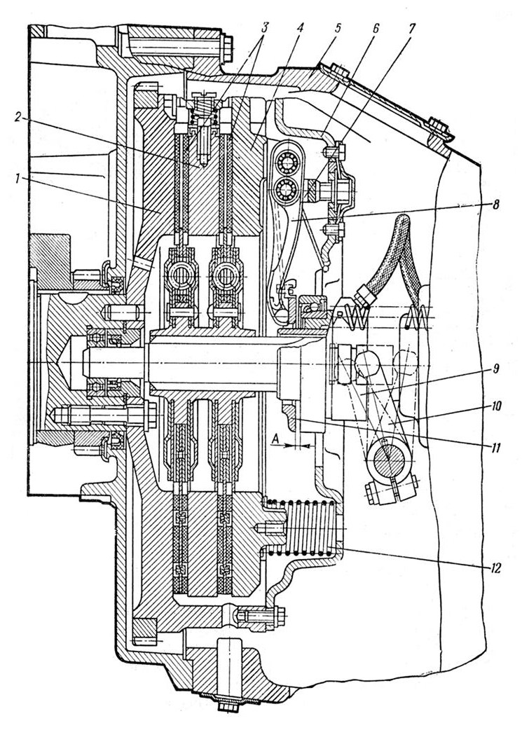 1 – маховик; 2 – средний ведущий диск; 3 – ведомый диск; 4 – нажимной диск; 5 – картер; 6 – кожух; 7 – опорная вилка; 8 – рычаг выключения; 9 – муфта выключения с подшипником; 10 – вилка выключения; 11 – упорное кольцо рычагов выключения; 12 – нажимная пружина; А – зазор между упорным кольцом рычагов выключения и подшипником муфты выключения