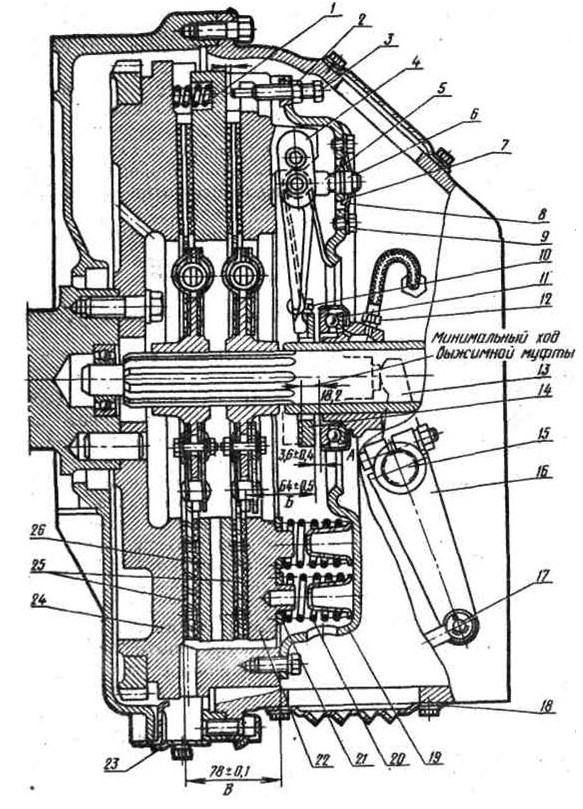 1 – отжимная пружина; 2 – контргайка; 3 – регулировочный винт; 4 – рычаг выключения; 5 – вилка рычага выключения; 6 – регулировочная гайка; 7 – стопорная шайба; 8 – опорная пластина; 9 – болт крепления опорной пластины; 10 – петля пружины рычага выключения; 11 – муфта выключения сцепления; 12 – шланг подачи смазки: 13 – вилка выключения сцепления; 14 – упорное кольцо; 15 – вал вилки выключения; 16 – рычаг вала вилки; 17 – палец; 18 – крышка люка картера сцепления; 19 – кожух сцепления; 20 – нажимная пружина; 21 – термоизолирующая шайба пружины; 22 – нажимной диск; 23 – крышка люка картера маховика; 24 – маховик; 25 – ведомые диски; 26 – средний ведущий диск