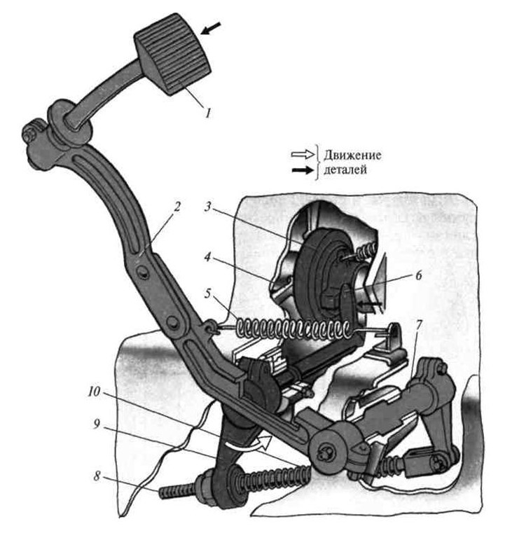 1 – педаль сцепления; 2 – рычаг педали; 3 – выжимной подшипник; 4 – рычаг выключения; 5 и 10 – пружины педали и тяги; 6 – вилка; 7 – вал привода; 8 – тяга; 9 – рычаг вилки