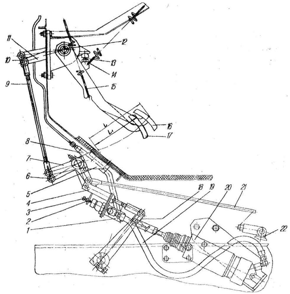1 – кран пневматический; 2 – контргайка; 3 – болт регулировочный; 4 – тяга с компенсатором; 5 – кронштейн; 6,22 – рычаги тормозного крана; 7 – рычаг привода сцепления; 8, 19 – шланги; 9 – тяга педали сцепления; 10 – тяга педали тормоза; 11 – рычаг вала педали сцепления; 12 – вал педали сцепления; 13 – ограничитель хода педали сцепления; 14 – пружина оттяжная педали тормоза; 15 – пружина педали сцепления; 16 – педаль сцепления; 17 – педаль тормоза; 18 – рычаг вала вилки выключения сцепления; 20 – пневмоцилиндр; 21 – тяга тормозного крана; L – полный ход педали сцепления; L1 – полный ход педали тормоза