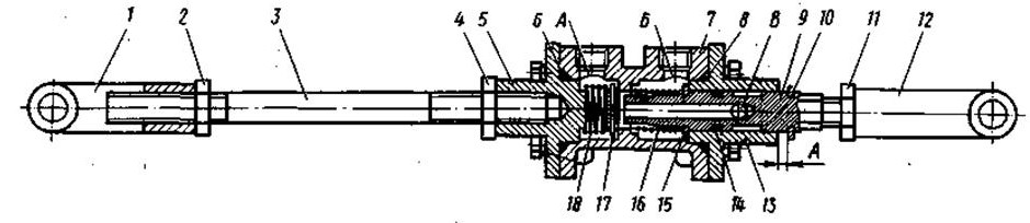 1,6,9 – тяги; 2 – педаль; 3 – палец; 4,7,11 – рычаги; 5 – оттяжная пружина; 8,12,15 – вилки; 10 – стопорное кольцо; 13 – цилиндр; 14 – шток цилиндра; 16 – клапан; А – зазор