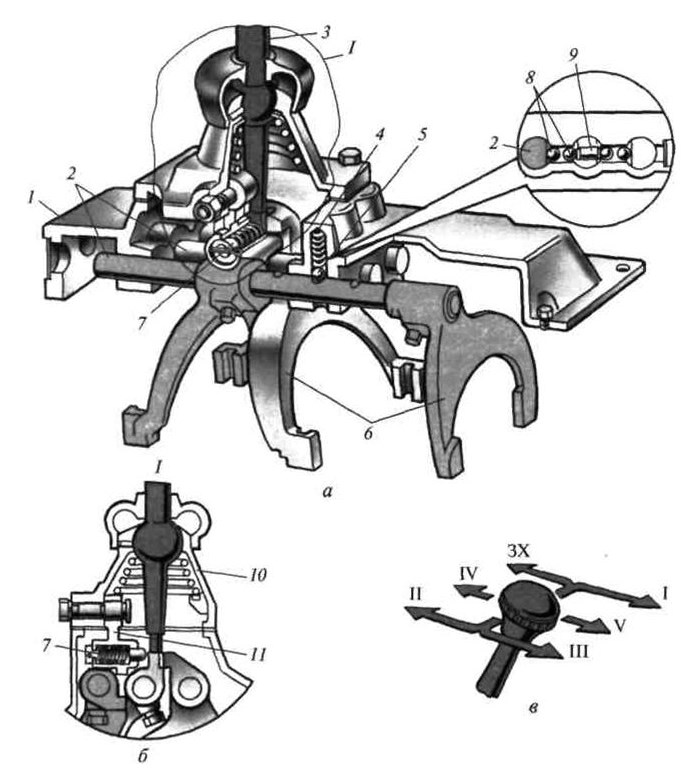 а – устройство; б – предохранитель включения заднего хода; в – схема переключения рычага передач; 1 – крышка; 2 – ползуны; 3 – рычаг переключения передач; 4 – пружина фиксатора; 5 – шарик фиксатора передачи; 6 – вилки; 7 – предохранитель включения заднего хода; 8 – шарики замка; 9 – штифт замка; 10 – корпус рычага; 11 – промежуточный рычаг включения первой передачи и заднего хода; I – V – передачи; ЗХ – задний ход