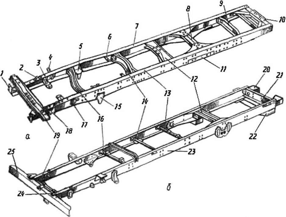 а – КамАЗ – 5320; б – Урал – 4320; 1 – кронштейн крепления переднего буфера; 2 – кронштейн крепления жидкостного радиатора; 3, 5 – кронштейны крепления двигателя; 4, 17 – кронштейны крепления верхнего ушка амортизатора; 6 – кронштейн; 7, 14, 23 – лонжероны рамы; 8, 9, 10, 12, 14, 16, 19, 21 – поперечные балки; 11 – подкладка кронштейна задней подвески; 15 – задний кронштейн передней подвески; 18 – передний кронштейн передней подвески; 20 – задний буфер; 22 – поперечина сцепного устройства; 24 – буксирный крюк; 25 – передний буфер