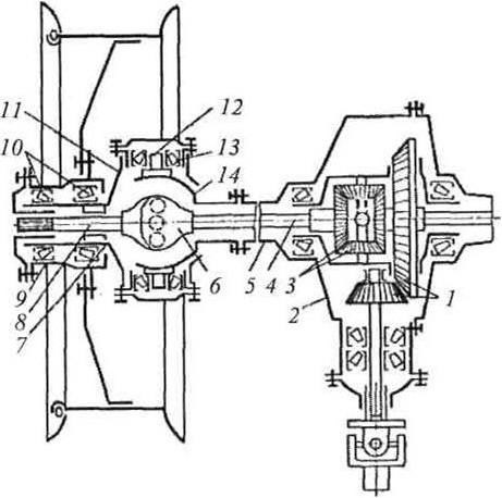 1 – главная передача; 2 – картер; 3 – дифференциал; 4 – полуось; 5 – полуосевой рукав; 6 – шарнир; 7 – цапфа; 8 – приводной вал; 9 – ступица; 10, 13 – подшипники; 11 – корпус поворотного кулака; 12 – шкворневой палец; 14 – наконечник