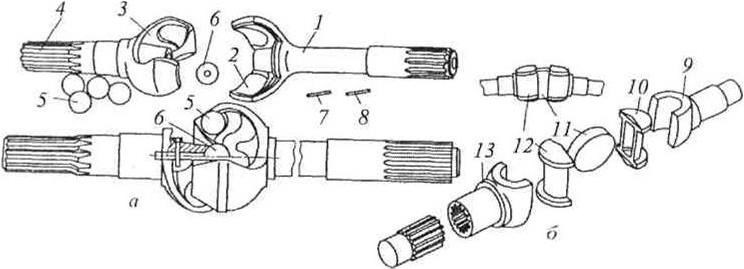 а – шарикового типа; б – кулачкового типа; 1 – полуось; 2, 3, 9, 13 – вилки; 4 – приводной вал; 5 – шарики; 6 – центрирующий шарик; 7 – шпилька; 8 – палец; 10, 12 – кулаки; 11 – диск