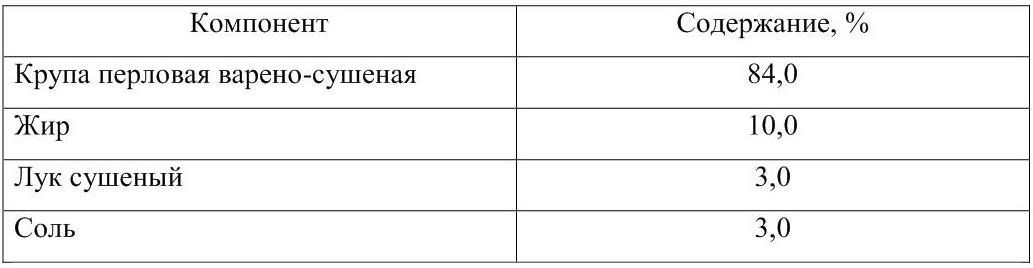 Нормы расхода сырья утверждаются на предприятии ежегодно, так как они могут меняться в зависимости от качества сырья и технического состояния оборудования. В качестве примера рассмотрим расчет расхода сырья на производство концентрата «Каша перловая с луком», вырабатываемого по следующей рецептуре, представленной в таблице 1.