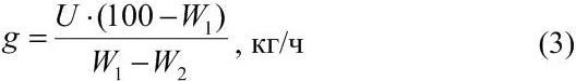 Одним из важнейших показателей работы сушилок является ее производительность. Для возможности сравнивать производительность сушилок, высушивающих материалы с различным влагосодержанием, принято производительность сушильных аппаратов считать по количеству влаги, испаренной в час (U, кг/ч). Зная этот показатель, можно рассчитать производительность сушилки по конкретному продукту, g (кг/ч), по формуле (3):