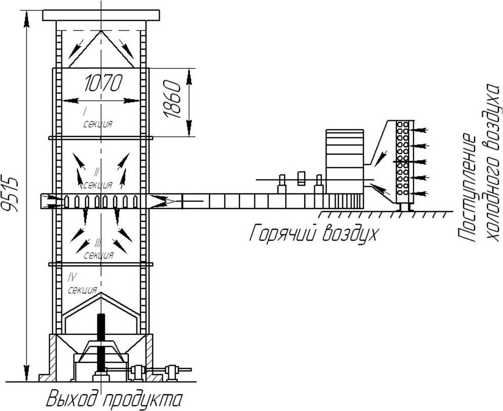 Продукт по пути движения пронизывается нагретым в отдельно стоящем калорифере воздухом, поступающим во внутренний цилиндр, и в нижней части сушилки выгружается специальным устройством. Отработавший воздух из сушилки выбрасывается в помещение, где установлена сушилка, и оттуда удаляется в атмосферу вентилятором.