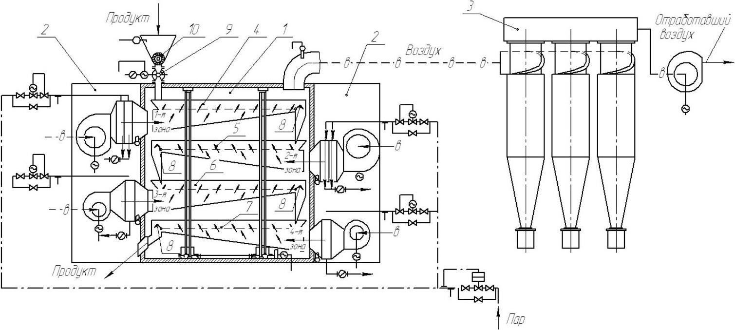 1 – сушильная камера; 2 – вентиляционно-калориферная станция; 3 – батарея циклонов; 4, 5, 6, 7 – металлические короба; 8 – поворотный порог; 9 – роторный барабанный питатель; 10 – ворошитель типа «беличье колесо»