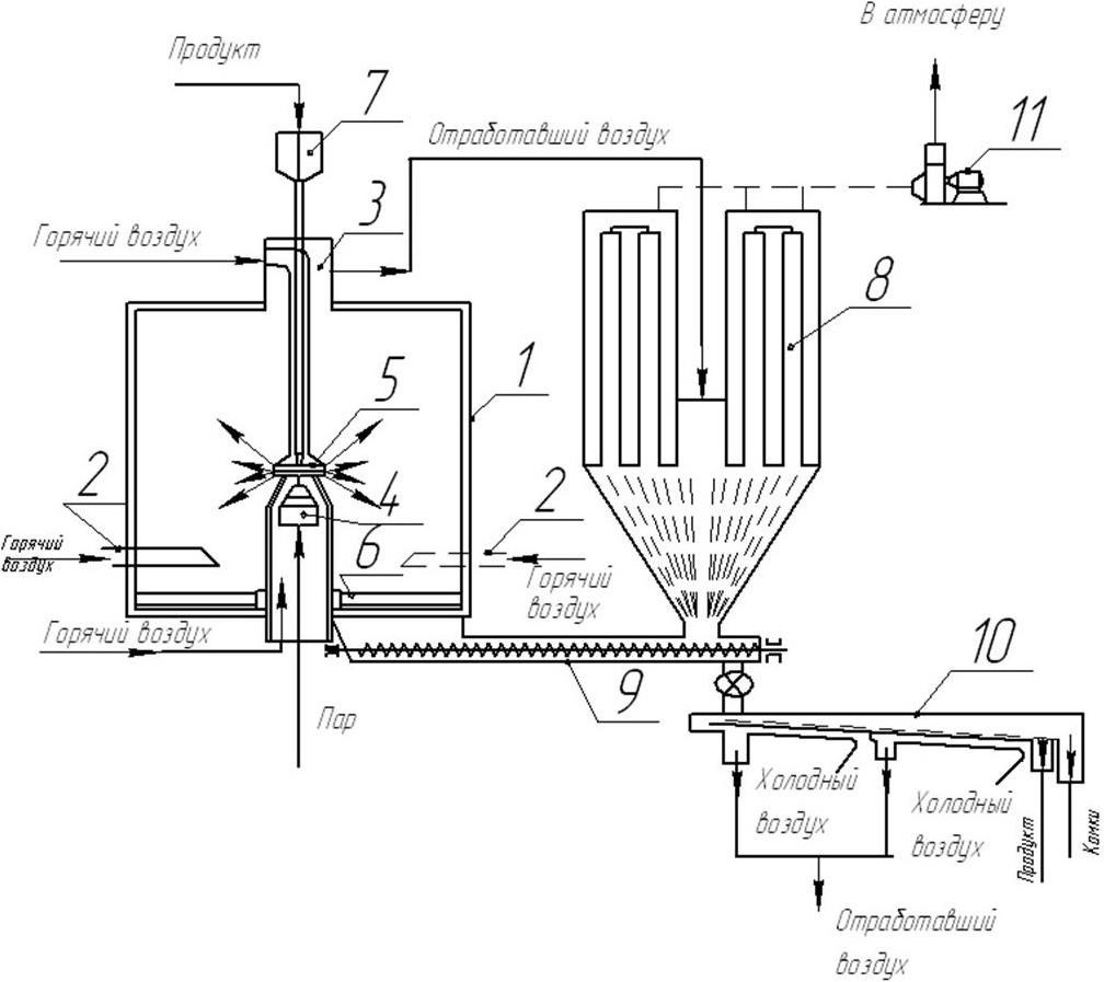 1 – сушильная цилиндрическая башня; 2 – тангенционный ввод; 3 – верхнее перекрытие; 4 – паровая турбина; 5 – распылительный диск; 6 – уборочный вращающийся механизм; 7 – напорный бачок; 8 – рукавный фильтр; 9 – шнек; 10 – сито; 11 – вентилятор