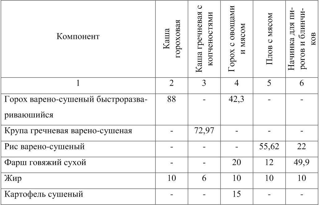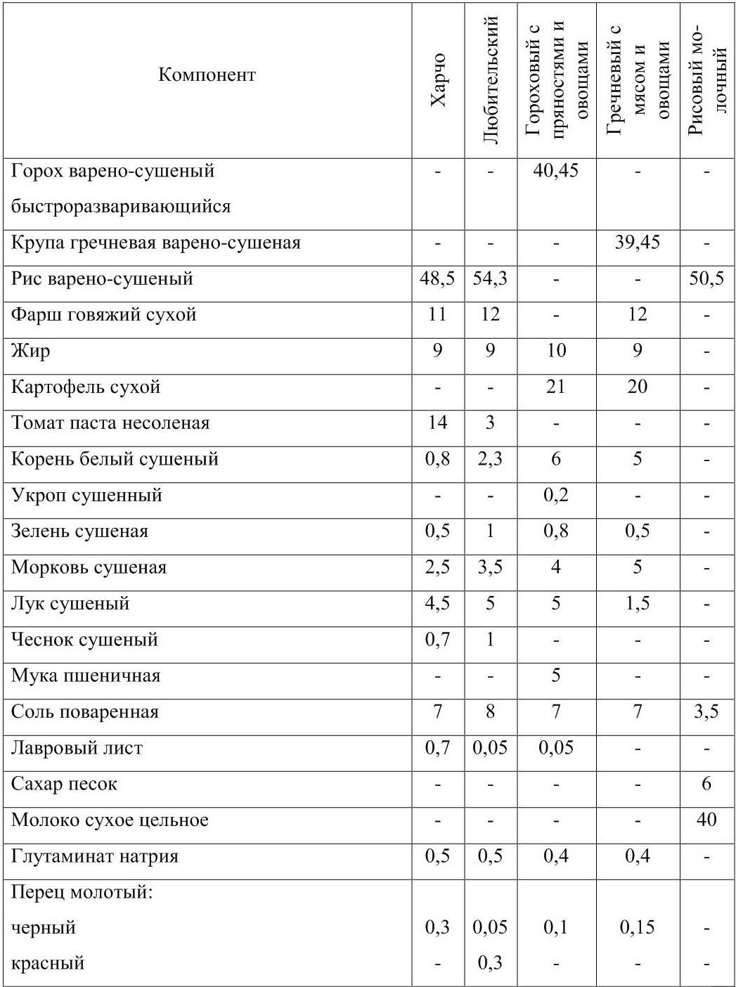 Таким образом, самый широкий ассортимент пищевых концентратов первых блюд представлен крупяными и овощными супами. Рецептуры супов строго индивидуальны и включают по 10–13 компонентов (таблица 2).