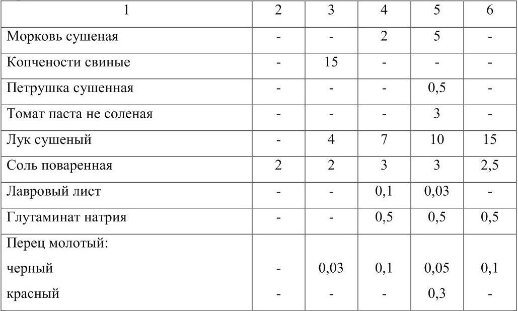 Таблица 2 – Рецептуры пищевых концентратов первых обеденных блюд, %