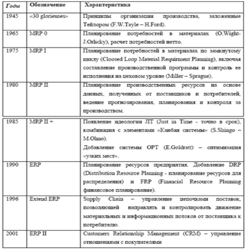 С накоплением опыта моделирования производственных и непроизводственных бизнес -процессов эти понятия постоянно уточняются, постепенно охватывая функций. Развитие стандарта MRP/ERP проиллюстрировано в Таблице 1.1.1.