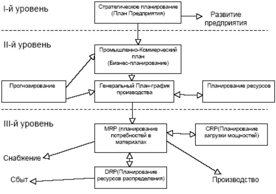 5. Capacity Requirements Planning (CRP)– планирование потребления мощностей. Эту функциональность можно условно отнеси к трем уровням планирования, отражающим иерархию планов в ERP-модели (см. рис. 1.1.8).