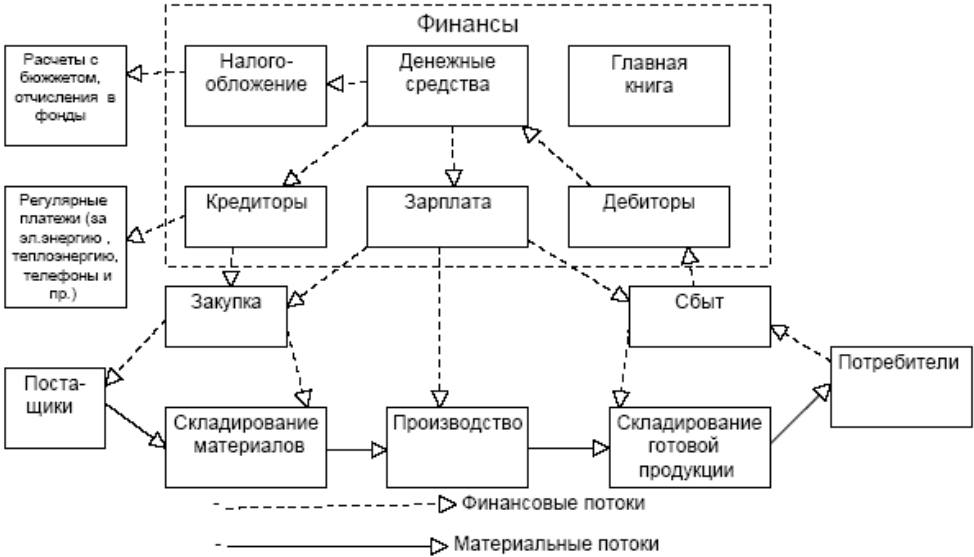В соответствии с идеологией MRP/ERP эта подсистема полностью интегрирована со всеми остальными и позволяет оперативно получать информацию о финансовых потоках, связанных с потоками материальными (см. рис. 6), о текущем финансовом состоянии компании, и помогает находить оптимальные финансово – экономические решения. Сквозное управление материальными потоками находит свое отражение в управлении финансовыми потоками (движении денежных средств).