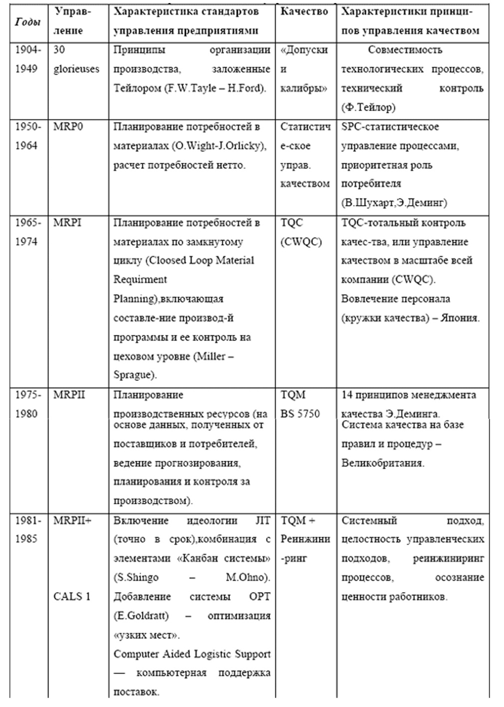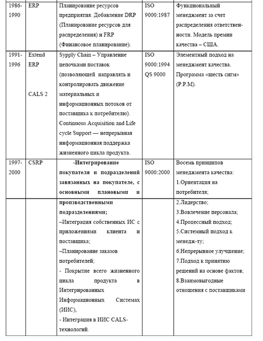 Как видно из Таблицы источником развития ERP-стандартов и Стандартов Качества является «Научная организация труда» Ф. Тейлора. С развитием Вычислительной Техники (ВТ) произошло разделение на Систему Управления производством (которая опиралась на автоматизированную поддержку) и на Систему управления качеством (которая, помня заветы Э.Деминга, больше опиралась на бумажные процедуры и производственные философии). CALS-идеология, появившаяся в середине 80 гг. прошлого века, протянула мостик между «Автоматизированными Системами Управления(АСУ) и Проектирования(САПР)» и «Системой качества (СК)», вводя стандарты управления как структурированными документами (характерными для АСУ), так и неструктурированными документами (характерными для СК). С конца 80 гг. развитие АСУ было направлено в сторону Интегрированной Информационной Системы (ИИС), впитывающей в себя как CALS-технологии, так и методологии Системы Качества. Фундаментом такой интеграции стало:
