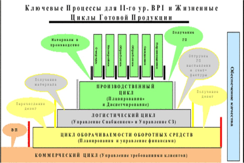 Переход с I–го на II-й уровень BPI предполагает использование ключевых процессов, которые при совместном выполнении приводят к достижению целей внедрения новой бизнес – модели предприятия на базе методики MRPII и технологий ERP-системы.