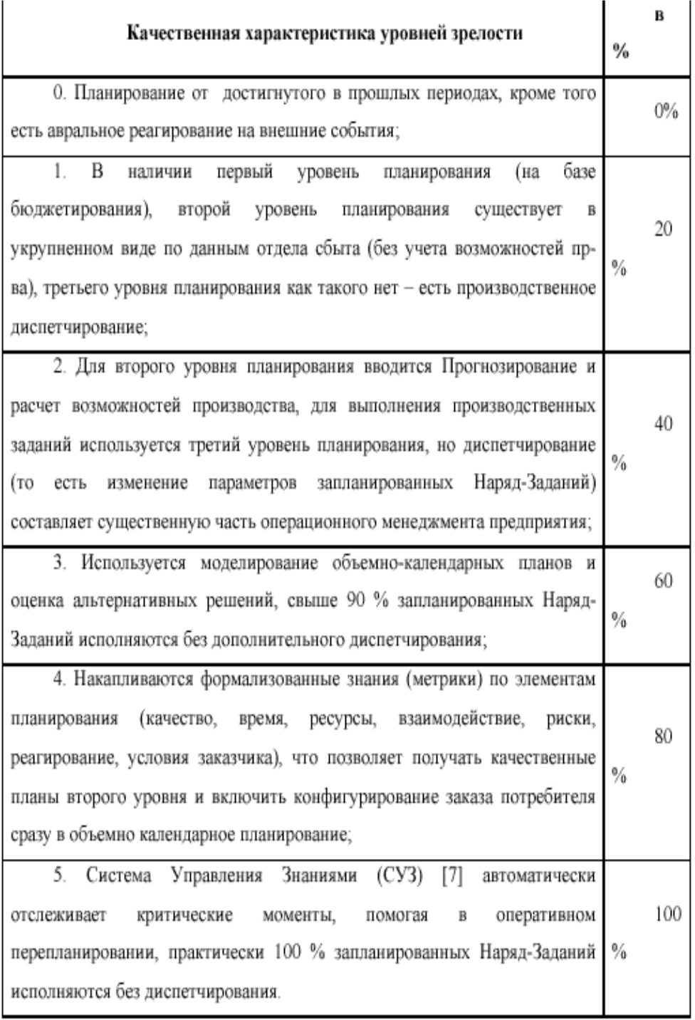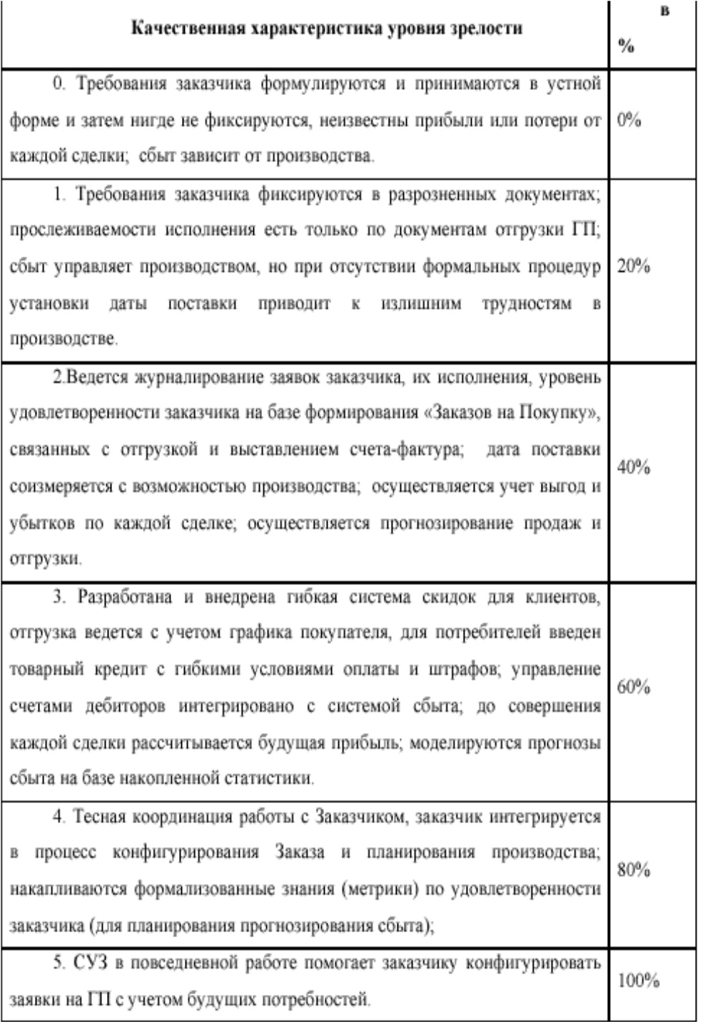 Далее будут рассмотрены цели в Ключевых Процессах. Ключевые Процессы соотносятся с элементами стандарта ИСО 9001:2000. Качественная и количественная оценка Ключевых Процессов соответствует следующим уровням BPI: 20 % – 1-й уровень BPI; 40 % – 2-й уровень BPI; 60 % – 3-й уровень BPI; 80 % – 4-й уровень BPI; 100 % – 5-й уровень BPI.