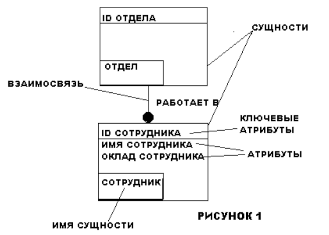 На ней представлены две сущности с именами “Отдел” и “Сотрудник” и взаимосвязь между ними с именем “работает в”. Имя взаимосвязи всегда выражается в глагольной форме. Если же между двумя или несколькими объектами реального мира не существует установленной зависимости, то с точки зрения IDEF1, между соответствующими им сущностями взаимосвязь также отсутствует.