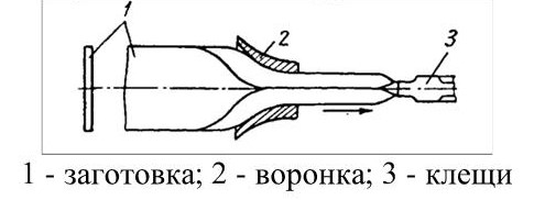 Процесс изготовления труб сваркой встык на цепных станах начинают с того, что у одного конца полосы обрезают углы, а сам конец загибают (рисунок 7). Затем заготовку 1 нагревают в печи до сварочной температуры 1300-1350 °C. После чего специальными клещами 3 захватывают за загнутый конец полосы (или приваренного стержня) и протягивают ее через воронку 2, в которой она одновременно сворачивается в трубу и благодаря давлению сваривается встык. При малых диаметрах труб к заготовке приваривается стержень. Окалина перед сваркой сбивается струей сжатого воздуха.