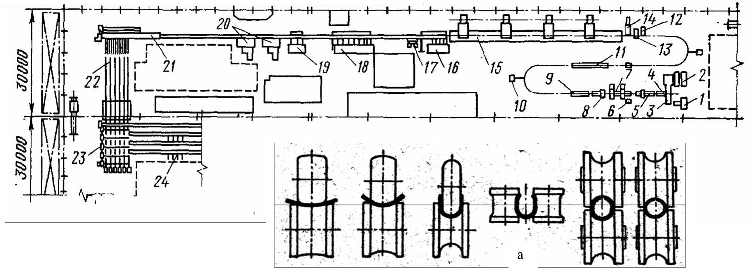 1 – весы для взвешивания рулонов; 2 – приемное устройство для рулонов; 3 – консольно-поворотный кран; 4 – загрузочное устройство; 5 – разматыватель штрипса; 6 – девятироликовая правильная машина; 7 – ножницы для отрезки концов; 8 – машина для сварки концов рулонов; 9 – тянущие ролики; 10 – регулятор петли; 11 – петлеобразователь; 12 – передвижные ножницы; 13 – автомат для приварки иглы к концу штрипса; 14 – машина для подачи штрипса в печь; 15 – печь для нагрева штрипса; 16 – шести клетевой формовочно-сварочный стан; 17 – летучие кривошипные ножницы для клетевого отделения иглы; 18 – четырнадцати клетевой редукционный стан; 19 – трехклетьевой калибровочный стан; 20 – летучая пила для разрезки труб на ходу; 21 – винтовая секция холодильника с винтовым сбрасывателем труб; 22 – цепная секция холодильника; 23 – делительное устройство; 24 – рольганги четырех линий отделки труб.