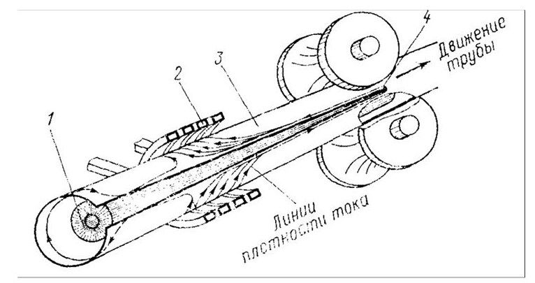 Магнитное поле индуктора 2 наводит в теле заготовки 3 ток, часть которого (рабочий ток) проходит по кромкам и замыкается через точку их схождения 4. Остальной ток замыкается по внутренней стенке трубы (шунтирующий ток). Для его уменьшения в полость трубы вводится сердечник 1 из феррита или трансформаторной стали (при 10 кГц), закрепленный на кронштейне, проходящем через щель заготовки. Сердечник интенсивно охлаждается водой. Возможен нагрев одновременно внешним и внутренним индукторами, что повышает скорость сварки и равномерность нагрева кромок.