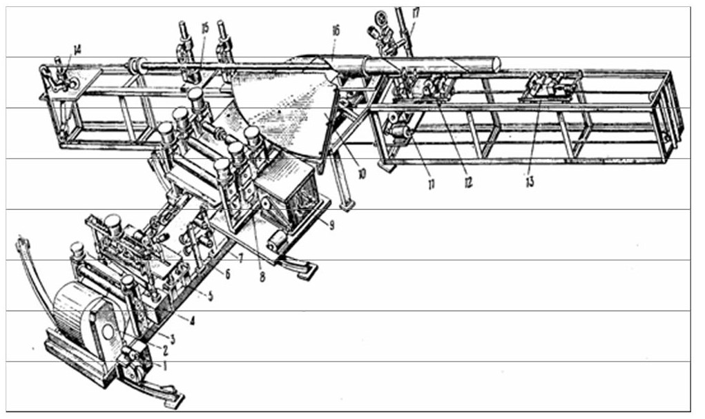 1 – механизм поворота рамы; 2 – разматыватель; 3 – приемные валки; 4 – гильотинные ножницы; 5 – установка для стыковой сварки ленты; 6 – зачистное устройство; 7 – рама задающего механизма; 8 – валковая клеть; 9 – коробка скоростей; 10 – щелевые проводки; 11 – механизм возврата; 12 – тележка с резаком; 13 – тележка концевая; 14 – поворотно-регулирующий блок; 15 – разжимное приспособление; 16 – формующая гильза; 17 – кронштейн сварочной головки.