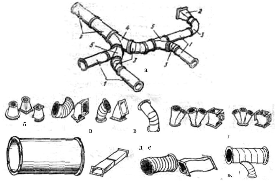 а – воздуховод; б – переходы; в – отводы и патрубок ответвления; г – тройники и крестовины; прямые участки д – круглого и е – прямоугольного сечения, ж – с патрубком ответвления