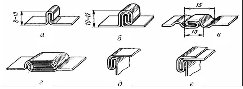 а – стоячий одинарный фальц; б – стоячий двойной фальц; в – одинарный лежачий фальц с двойной отсечкой; г – двойной лежачий фальц; д – одинарный угловой фальц; е – комбинированный угловой фальц.
