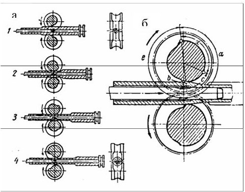 Периодический стан (пильгерстан) представляет собой нереверсивный двухвалковый стан. Валки его имеют круглый калибр переменного сечения (рисунок 17 б). Металл подается в валки навстречу их вращению. На этом стане производится прерывно – периодическая (пилигримовая) раскатка горячей гильзы в трубу на цилиндрической оправке. На рисунке 17 а дана схема процесса раскатки на этом стане при различных положениях 1, 2, 3, 4.