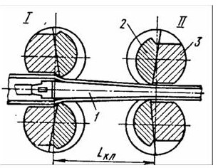 Наибольшее распространение при производстве холоднокатаных труб диаметром от 16 до 450 мм и толщиной стенки от 0,2 мм и выше получили двухвалковые станы с периодическим режимом работы клети. Трубы в данном случае, как это видно из рисунка 18, прокатываются на неподвижной конической оправке 1, установленной в калибре валковых сегментов 2, укрепленных на рабочих валках. Ручьи выполнены переменным радиусом, меняющимся по длине окружности сегмента от радиуса, равного радиусу трубной заготовки (начальный размер), до радиуса готовой трубы (конечный размер). Такие валки устанавливают в клети на жесткой раме, совершающей возвратно-поступательное движение по рельсам на катках.