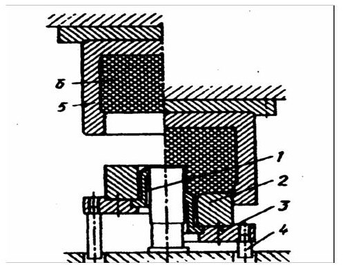 1 – предварительно вытянутая заготовка; 2 – ограничитель; 3 – упор; 4 – направляющие; 5 – стальная обойма; 6 – резиновая подушка