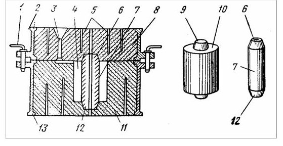 1 – штыри; 2, 13 – металлические рамки (опоки); 3 – литниковая чаша и стояк; 4 – рабочая полость формы; 5 – вентиляционные каналы; 6, 12 – стержневые знаки; 7 – стержень; 8 – верхняя и 11- нижняя полуформы; 9 – выступы на модели для стержневых знаков; 10 – модель
