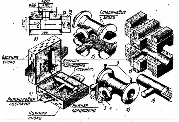 а – раскрытая изготовленная форма (в нижнюю полуформу вложен стержень); б – чертеж обработанной детали; в – разъемная деревянная модель со стержневыми знаком; г- разъемный деревянный стержневой ящик, д – стержень из специальной смеси с металлической арматурой, е – отлитый тройник с литниковой системой