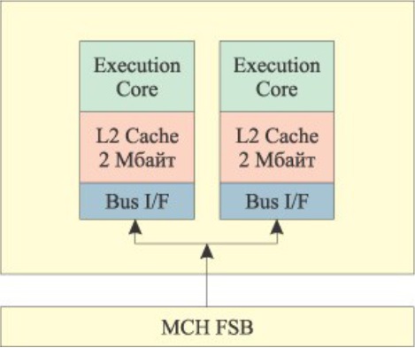 В отличие от двухядерных процессоров Pentium Extreme Edition и Pentium D в процессоре Presler два ядра размещены на разных кристаллах, то есть это будут два физически разделенных кристалла в одной упаковке в соответствии с рисунком 2. Такой подход к организации двухядерной архитектуры предоставляет достаточно гибкие возможности для отбраковки кристаллов, позволяя увеличить долю выхода годных двухядерных процессоров, а к тому же (и скорее всего, в этом главная причина) это позволяет одновременно с двухядерным процессором Presler выпускать и одноядерный аналог, причем кристаллы для обоих процессоров могут «нарезаться» из одних и тех же пластин [3].