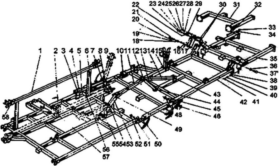 Рисунок 3.3 – Рама культиватора КШУ-12 (правая сторона от центра культиватора):1 – фиксатор; 2 – рама; 3,6 – фиксатор; 4 – винт, накладка, цапфа, шплинт 6.3?50; 5 – гайка, винта, цапфа, шплинт 6,3?50, шплинт 8?56; 7 – фиксатор, шплинт, пружинный 5,0х64; 8 – ось28?115 шплинт 6.3?50; 9,10 – фиксатор (транспортное положение); 11,14,17,30 – тяга; 12 – ось 28?138, гайка М20, шайба 20, шплинт 5?32; 13,38 –планка; 15 – гайка M16, шайба 16,65Г, скоба 2М 16?98?110; 16 – опора, амортизатор, ось 16?125, шплинт 4?25; 18 – ось 28?132; 19,28 – шайба 12; 20,27– шайба 12 65Г; 21,26 – гайка M12; 22 – ось 40?178; 23 – шплинт 5?32; 24 – гайка М20; 25 – шайба 20; 29 – ось; 31 – проставка; 32 – болт М 16?45; 33,40 – гайка М16; 34,39 – шайбы 16.65Г; 35 – подкрылок; 36 – шайба ШЭЗ-25; 37 – ось 28?90; 41 – шплинт 2.5x28; 42 – крыло; 43 – ось 20?95, шплинт 5?32; 44 – 6олт М20х120, гайка N420; 45,51 – шайба 20.65Г; 46,50 – стяжка; 47,52 – гайка М20; 48 – рама обводная; 49 – ось 28?132, накладка, гайка М20, шайба 20, шплинт 4?40; 53 – рычат; 54 – ось 40?210, шайба, шплинт 8?56; 55 – стяжка, гайка М20, шайба 20, шплинт 4?40; 56 – болт М120?55, гайка М20, шайба 16 65Г. Шайба; 20, 57– опора; 58 – амортизатор, ось 16?125, шплинт 4?25