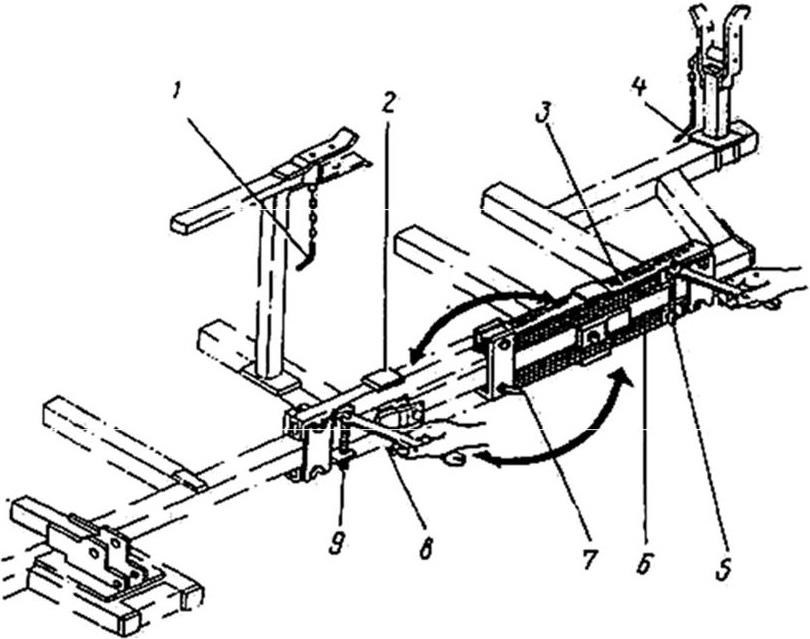 Рисунок 3.4 – Фиксация шарниров:1, 4 – замки; 2, 8 – положение фиксаторов при работе в поле; 3, 6 – положение фиксаторов для дальнего транспортирования; 5, 9 – винты; 7 – фиксатор, пружинный шплинт 5,0?64
