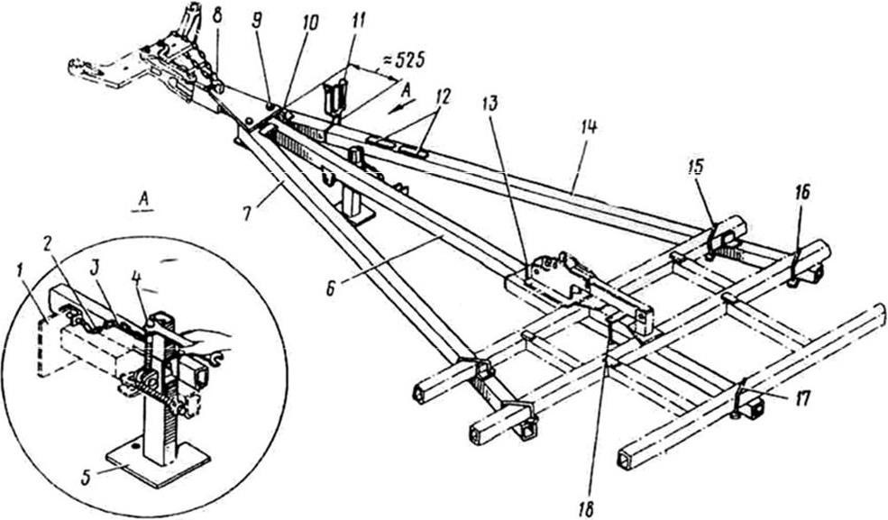 Рисунок 3.5 – Сница: А – положение подставки при работе (транспортировании): 2 – положение замка для фиксации подставки в рабочем положении; 3 – положение замка для фиксации подставки при отсоединении культиватора от трактора; 4 – винт; 5 – положение подставки при отсоединении культиватора от трактора; 6 – тяга; 7, 14 – лучи; 8 – цепь страховая, ось 25?80, шплинт пружинный 5,0?64; 9 – болт 2М20?120, гайка М20, шайба 20, шплинт 4?40; 10 – болт М120x75, гайка М20, шайба 20 65Г; 11 – держатель рукавов высокого давления, 12 – табличка; 13, 17 – скоба 2М20?149?200, гайка М20, шайба 20.65Г; 5, 16 – скоба 2М20?132?200, гайка М20, шайба 20 65 Г; 18 – скобы 2М20?102?200, гайка М20, шайба 20 65Г
