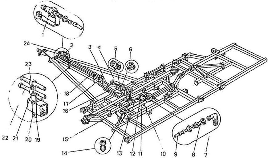 Рисунок 3.9 – Гидротрасса культиватора КШУ-12-02: 1 – корпус правый в сборе; 2,16 – рукав высокого давления (L=1805); 3 – рукав высокого давления (L=1005); 4 – гидроцилиндр Ц-100?200-2; 5 – штуцер ввертной; 6 – сапун; 7,15 – угольник ввертной с уплотняющей гайкой; 8 – клапан замедлительный; 9,11 – рукав высокого давления (L= 2005); 10 – гидроцилиндр I-80x800; 17 – тройник проходной; 18 – трубопровод (L=1796), 19 – кронштейн; 20 – скоба 2М 10?92?100/25. гайка M10, шайба 10.65Г; 21 – скоба; 22 – трубопровод (L=1791); 23 – болт М8?30, гайка М8, шайба 8.65Г; 24 – держатель, скоба 2 М 10?92?100/25. гайка M10, шайба 10.65Г