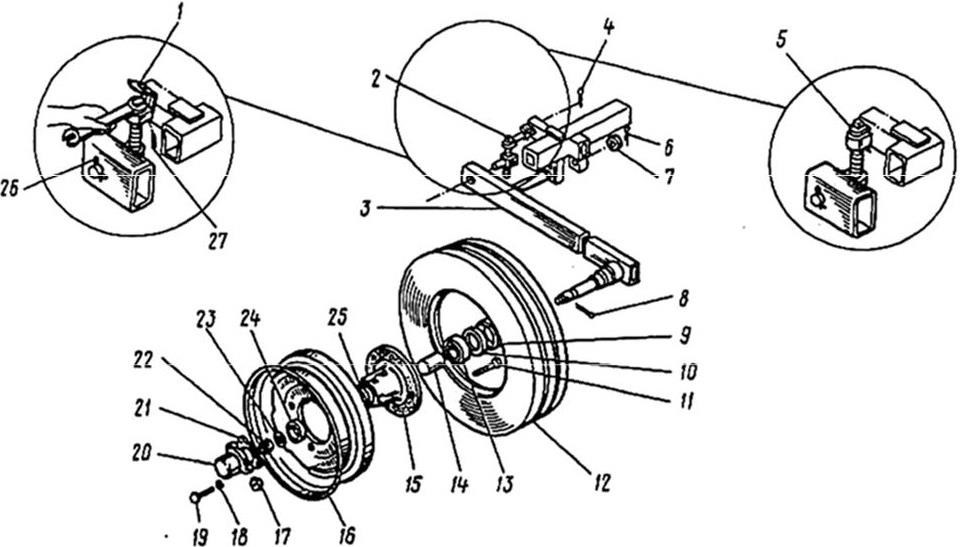 Рисунок 3.10 – Колесо: 1 – положение фиксатора при регулировке глубины; 2 – механизм регулировки;3 – кронштейн; 4,26 – шплинт 6,3?50; 5 – положение фиксатора при работе; 6 –шплинт 10?71; 7 – шайба; 8 – шплинт 4?40; 9 – колпачок; 10 – манжета 1.2-55?80; 11 – болт опорного колеса; 12 – шина 6,5?16; 13 – подшипник 208; 14 – втулка; 15 – ступица; 16 – диск с ободом; 17 – гайка крепления диска колеса; 18 – шайба 12.65Г, 19 – болт M12?20; 20 – крышка; 21 – прокладка; 22 – гайка корончатая М20; 23 – шайба; 24 – подшипник 207; 25 – кольцо С72; 27 – шплинт пружинный 5,0?64