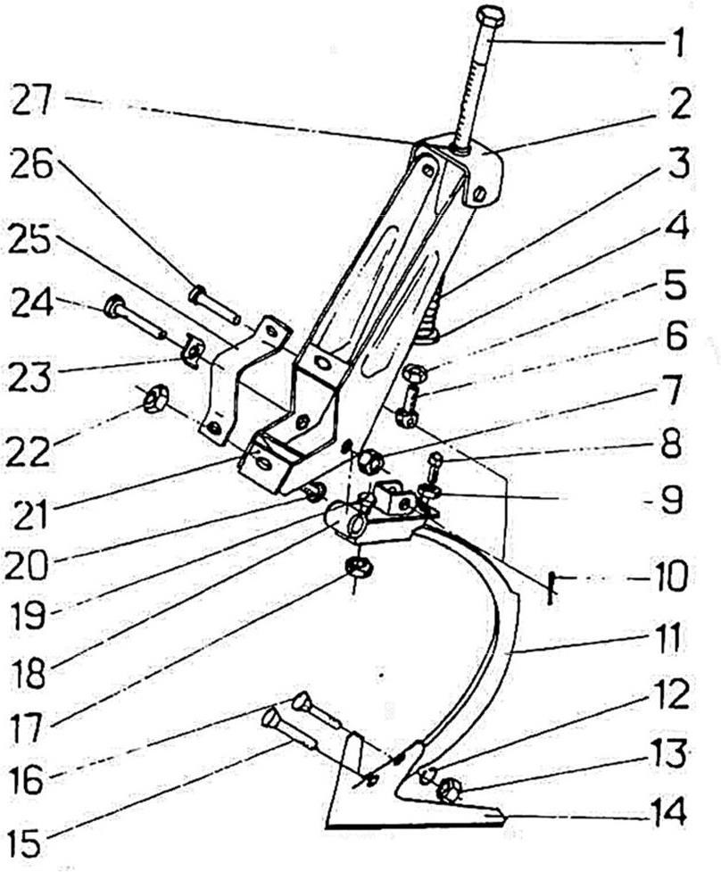 Рисунок 3.11 – Подвеска рабочих органов: 1 – стяжка; 2 – регулятор; 3 – пружина; 4 – шайба; 5 – гайка M16; 6 – кулиса; 7 – гайка M12, шайба 12.65Г, шайба 12.01; 8 – винт АМ12х30; 9 –гайка М12; 10 – шплинт 5?28; 11 – стойка Н.043.16.503; 12 – шайба 10.65Г; 13 – гайка М10; 14 – лапа 5,5 (Н.043.05.402-02); 15 – болт Н.043.00.601; 16 – болты.043.00.601-01; 17 – гайка М16, шайба 16.65Г; 18 – держатель; 19 – болт 16?40; 20 – болт 16?60; 21 – кронштейн; 22 – гайка M16, шайба 16.65Г; 23 – упор; 24 – ось; 25 – скоба; 26 – ось 18?65, 27 – шайба
